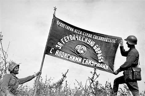 Soldats soviétiques avec leur drapeau la victoire la bataille de Khalkha gol : Prolétaires de tous les pays, unissez-vous! Pour la lutte héroïque contre les samouraïs japonais.