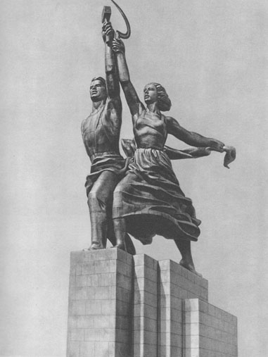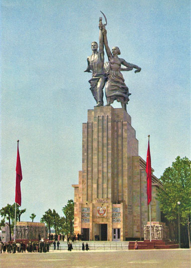 On y trouvait notamment à l’entrée le fameux monument de l’ouvrier et de la kolkozienne, réalisé par Vera Moukhina, qui fut également présent à l’Exposition universelle de 1937 à Paris, où il faisait face d’ailleurs au monument de l’Allemagne nazie.