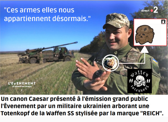Dès la fin octobre 2022, il avait été remarqué par Rosa la gazette l’apparition d’un commandant d’artillerie arborant une Totenkopf stylisée tirant des obus d’un canon CAESAR français…sans qu’il ne soit fait mention du caractère néo-nazi du personnage par France 2.