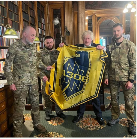 Ce n’est pas forcément gagné : voici une photographie de l’ancien premier ministre britannique Boris Johnson le 22 mai 2024, avec des nazis d’Azov invités au Parlement britannique…