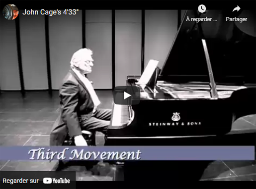 « Le titre de cette œuvre figure la durée totale de son exécution en minutes et secondes. À Woodstock, New York, le 29 août 1952, le titre était 4′33″ et les trois parties 33″, 2′40″ et 1′20″.