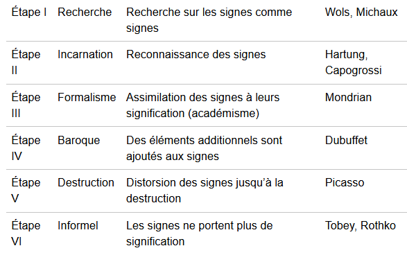 Voici un tableau formulé par Georges Mathieu, un peintre français ayant une importance considérable dans « l’abstraction lyrique » c’est-à-dire l’abstraction à la française. On y voit comment les « signes » c’est-à-dire les éléments sur le tableau sont censés avoir été assimilés par l’abstraction, puis modifiés, distordus, jusqu’à aboutir à des œuvres censées porter quelque chose d’ultime.