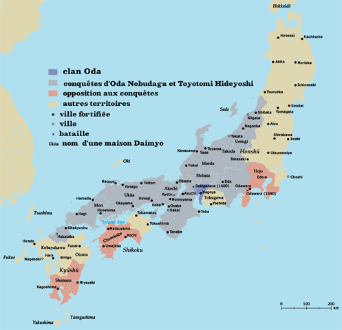 Le pouvoir finit alors, après des décennies d’affrontements des principales factions s’étant formées, par revenir à deux figures unissant l’une après l’autre une vaste partie du pays : Oda Nobunaga (1534-1582), puis Toyotomi Hideyoshi (1537-1598). On notera qu’en japonais, le prénom est en seconde position.