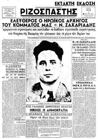 Grande figure historique cependant du KKE – à ce titre, Níkos Zachariádis était très connu des masses – la nouvelle de son retour, annoncée le 1er mai 1945 dans l’organe du Parti Rizospastis, provoqua une onde de choc.