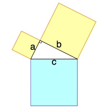 Le triangle précède le carré ; on a un exemple intéressant du rapport entre triangle et carré dans le théorème de Pythagore justement, qui dit que dans un triangle rectangle, le carré de la longueur de l’hypoténuse est égal à la somme des carrés des longueurs des deux autres côtés. Dans l’image suivante, l’aire du grand carré bleu est la somme des aires des deux autres carrés.