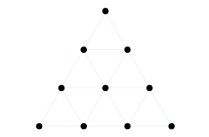 Ici on peut se tourner vers le « Tetraktys » de Pythagore, qui a vécu en Grèce antique au 6e siècle avant notre ère. Pythagore avait élaboré toute une mystique des nombres, qui ne nous intéresse pas ici. Ce qui compte, c’est qu’il valorise 1 + 2 + 3 + 4 = 10 comme clef pour comprendre le monde, et que dans la forme dite « Tetraktys » qu’il propose pour présenter cette clef, on retrouve le triangle.