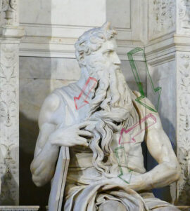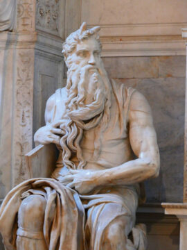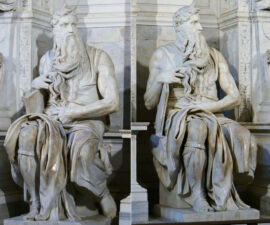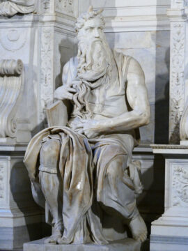 Cela se lit parfaitement dans le Moïse de Michel-Ange, réalisé dans la période 1513-1516 ; c’est une oeuvre en marbre, d’une hauteur de 235 cm.