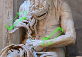 La première, c’est que si on y prend garde, Moïse est en fait très en arrière dans sa posture. Cela a donné à certains commentateurs l’impression d’ailleurs qu’il était en train de se lever ; il fut pensé à la scène du veau d’or et Moïse courroucé se lance contre eux. En réalité, Michel-Ange devait massifier l’assise pour donner de la contenance à la pose.