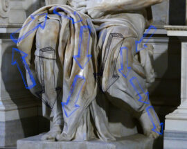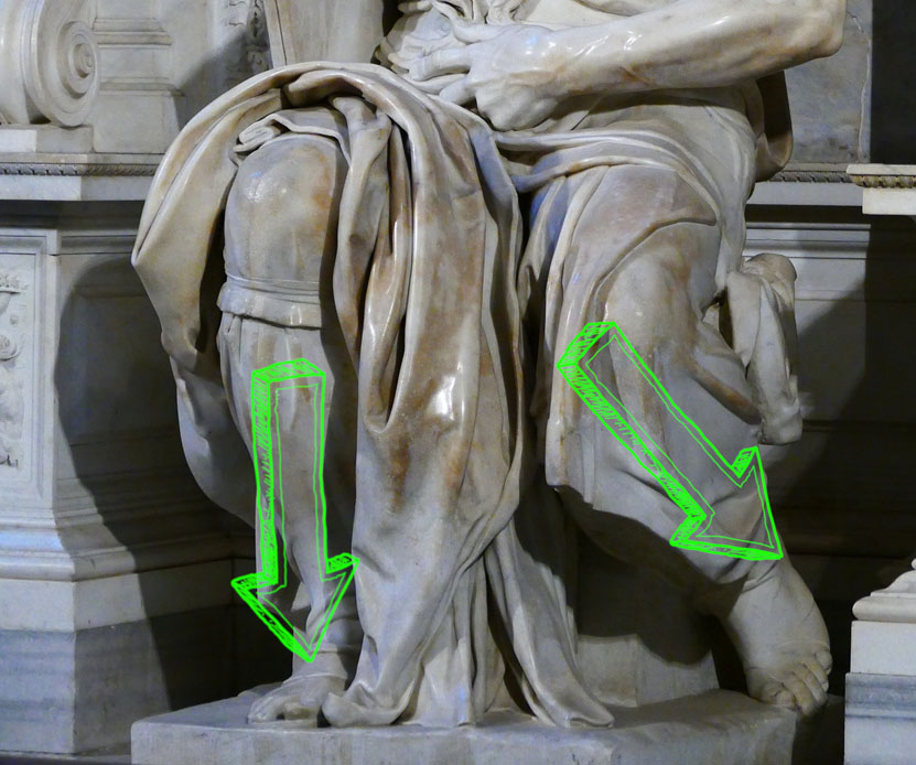 Michel-Ange a, naturellement, rendu bien plus complexe cette opposition, en ajoutant un puissant contraste. Le tissu sur la jambe droite est plié et replié, il est comme en mouvement, s’opposant évidemment à la raideur de la jambe sur laquelle il est posé.