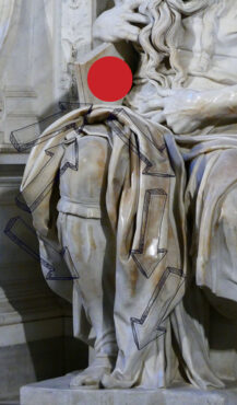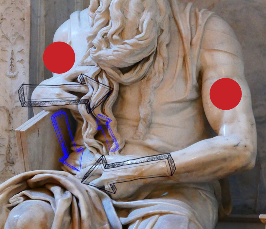 Il faut évidemment que le buste suive, et là Michel-Ange va profiter du drapé pour asseoir l’opposition, tout en ajoutant une bande sur le haut du bras gauche afin de neutraliser celle-ci et de maintenir la cohérence de la pose. Cela ne suffirait pas et Michel-Ange profite du haut de l’habit de Moïse pour ancrer la scène, notamment au-dessus des tables de la loi, qui elles-mêmes exercent un poids absolument nécessaire à l’équilibre de l’ensemble.