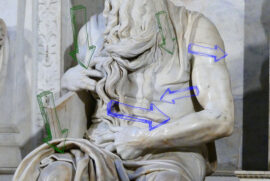 C’est alors que Michel-Ange a l’idée d’ajouter des éléments faisant de ce Moïse un chef d’œuvre. La difficulté, on la devine, c’est qu’une statue implique une terrible rigidité. Sur le plan plastique, tout est figé. Même si l’on ajoute quelques éléments semblant en mouvement, la statue est comme posée pour l’éternité.