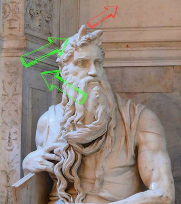 Pour que la tête ne disparaisse toutefois pas dans le processus, Michel-Ange a rééquilibré dans l’autre sens avec deux cornes. Celles-ci relèvent d’une tradition erronée dans le catholicisme romain, l’hébreu parlant de rayons lumineux.
