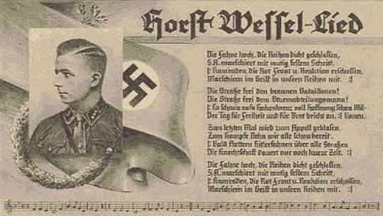 L’idéologie national-socialiste est synthétisée le mieux dans la chanson de la S.A., intitulée chanson de Horst Wessel. Cette chanson n’a d’ailleurs pas été que l’hymne de la S.A., mais celle du parti nazi lui-même ; elle fut systématiquement chantée, de 1933 à 1945, après l’hymne allemand dans les cérémonies officielles.