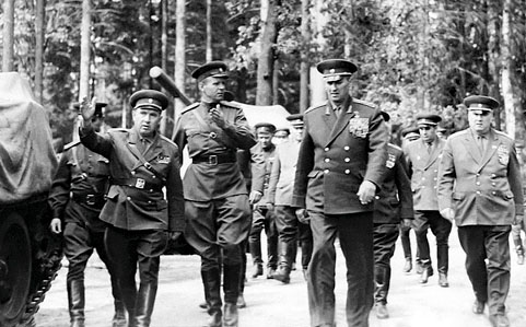 Le ministre de la Défense de l’URSS, le maréchal Andrei Grechko inspecte la 14e division de fusiliers motorisés des forces soviétiques en RDA une semaine avant l’invasion de la Tchécoslovaquie.