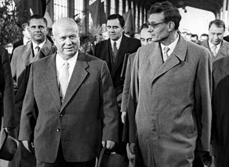 Les révisionnistes Nikita Khrouchtchev et Mikhaïl Souslov avec Andrei Gromyko à l’arrière-plan