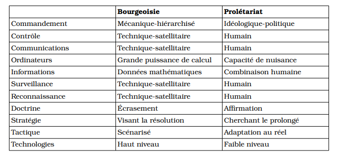 Ce qui compte principalement, c’est de voir que pour le matérialisme dialectique, la guerre populaire a comme cœur le peuple ; pour les états-majors, la guerre impérialiste a comme cœur la technologie. Pour la guerre populaire, le chef est un soldat qui indique une voie et chaque soldat est un chef à petite échelle ; pour la guerre impérialiste, les soldats ne sont que des pions placés selon les calculs de l’état-major.
