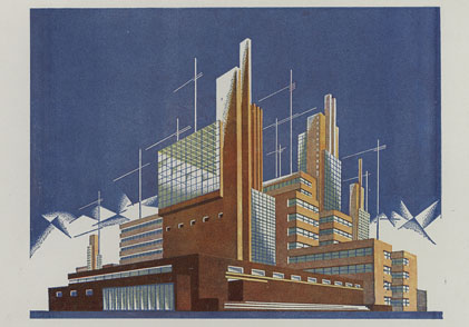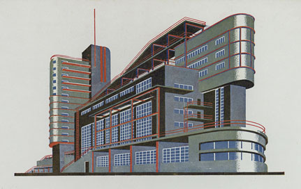Iakov Tchernikhov, comme l’ensemble des architectes à quelques exceptions près, prit le tournant réaliste socialiste du début des années 1930, mais prisonnier de son approche compositionnelle, il se tourna vers l’aspect monumentaliste seulement.