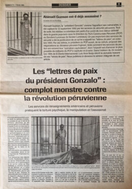 Abimaël Guzman, le « président Gonzalo » comme l’appellent ses camarades, a été capturé le 12 septembre 1992 par les services de sécurité péruviens. Tout de suite, les médias occidentaux ont parlé d’un point de non-retour définitif dans la guerre populaire sous la direction du Parti Communiste Péruvien (PCP) ou Sendero Luminoso (le Sentier Lumineux). Un pas important des services de sécurité a été la publication de ce qu’on a appelé les « lettres de paix », en octobre 1993. Par ces lettres, le président du PCP aurait, de sa cellule, proposé des négociations au dictateur péruvien Fujimori. Voilà comment les services de police ont entamé leur « opération capitulation », dont l’objectif est d’amener le plus possible de militants du PCP à capituler et à trahir. Dans l’édition du 24 novembre 1994 de El Diario lnternacional, Luis Arce Borja décrit la véritable histoire e de ces « lettres de paix ». Nous publions ci-dessous la version intégrale de cet article.