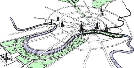 Ici en 5 le Palais des Soviets, ainsi que : 1 – l’Université d’État de Moscou 2 – l’Hôtel Ukraine 3 – l’immeuble d’habitation sur la place Koudrinskaïa 4 – le Ministère des Affaires étrangères 6 – Bâtiment administratif à Zaryadye (qui ne sera pas terminé) 7 – l’Hôtel Leningrad 8 – le Ministère de l’industrie lourde 9 – l’immeuble d’habitation sur la berge Kotelnitcheskaïa
