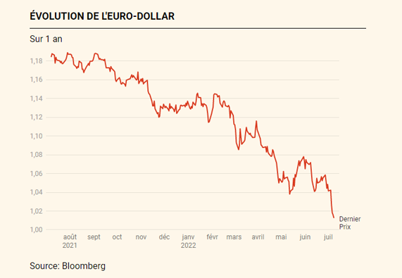 C’est un cap symbolique qui a été passé le 12 juillet 2022, l’euro ayant atteint la parité avec le dollar. Autrement dit, un euro = un dollar, alors qu’auparavant l’euro était systématiquement plus fort que le dollar quasiment depuis sa création. C’est le résultat d’une dépréciation de 19% depuis le début de l’année 2022 et de 37% par rapport au record d’avril 22 avril 2008, lors de la crise financière touchant de plein fouet les États-Unis.