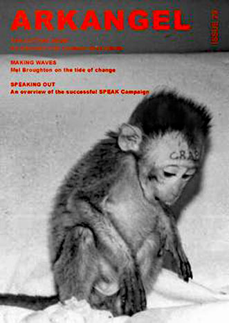 Couverture de la revue britannique Arkangel, proche de l’ALF, avec une photo d’un macaque libéré en 1984 par l’Animal Liberation League dans un raid mené contre l’Université Royale des chirurgiens de Grande-Bretagne. Sur son front avait été tatoué « crap » (« merde ») par les « chercheurs ».