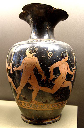 Lampadédromie (c’est-à-dire une course de flambeaux) sur une Œnochoé (soit pichet à vin), 4e siècle avant notre ère