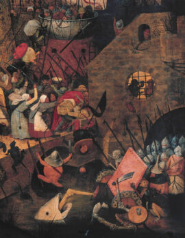 Un exemple significatif de l’état d’esprit qui va avec la ville comme nouvelle forme sociale, c’est la peinture de Margot la folle, ou Dulle Griet, Griet est le diminutif flamand du prénom Marguerite en français. C’est une personnage du folklore de la ville de Gand, et le tableau représente le proverbe disant : « elle pourrait piller l’enfer et en revenir indemne ». On a ici Margot pillant l’enfer.