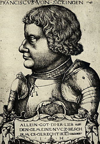 « Sickingen, qui était déjà reconnu comme le chef politique et militaire de la noblesse de l’Allemagne moyenne, et Hutten fondèrent en 1522, à Landau, une ligue de la noblesse rhénane, souabe et franconienne pour une durée de six années, soi-disant dans un but défensif.