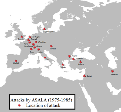 Le point culminant de l’échec à une stratégie cohérente aboutira, après une multitude d’attaques armées dans différents pays contre des intérêts turcs, à deux actions assassines, avec deux actions à la bombe dans des aéroports, en 1982 à Ankara (tuant neuf personnes) et en 1983 à Orly (tuant huit personnes au comptoir de Turkish Airlines).