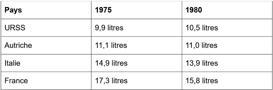 Ce n’est pas tout. L’alcool consommé en URSS social-impérialiste, c’était la vodka. Si on prend la fin des années 1970, en France on consommait 6 litres de boissons fortes, 90 litres de vin, 44 litres de bière, et en URSS au même moment 11 litres de boissons fortes, 19 litres de vin, et 23 litres de bière.
