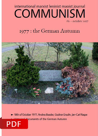 For this reason, we wish to stress here the historical signification of the murders of Andreas Baader, Gudrun Ensslin and Jan-Carl Raspe, political prisoners of the Red Army Fraction, in the night of the 17th of October, 1977. Those murders form a major political event in the frame of the struggle between revolution and counter-revolution in the imperialist metropoles.