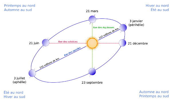 La date réelle du solstice d’hiver se situe en général le 21 décembre et parfois le 22 décembre (selon les années), celle du solstice d’été est le 21 juin et parfois le 22 juin. Il y a deux étapes intermédiaires, où la durée du jour et de la nuit sont équivalentes, ce sont les équinoxes du printemps et de l’automne qui se situe respectivement le 20 mars (et parfois le 21) et le 22 septembre (et parfois le 23). Ces quatre étapes remarquables de la course de la Terre autour du Soleil sont utilisées dans notre calendrier comme marqueurs des saisons ; pour plus de de commodités, c’est à chaque fois la date du 21 qui a été retenue, ainsi l’hiver commence le 21 décembre, le printemps le 21 mars, l’été le 21 juin et l’automne le 21 septembre.