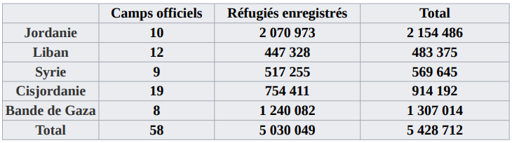 Il y a ainsi 1,6 millions de Palestiniens en Israël même, 2,8 millions en Cisjordanie, 1,8 à Gaza… et autour de 6 millions éparpillés dans le monde, principalement dans les pays arabes voisins. Les Israéliens forment eux une population de 9,7 millions de personnes, dont 7,1 millions sont des Juifs. Un retour des réfugiés palestiniens, du moins d’une partie significative d’entre eux, bouleverserait le rapport démographique. Ce n’est pas tout : une partie des Palestiniens de Cisjordanie et de Gaza sont eux-mêmes des réfugiés. Voici les chiffres pour 2014.