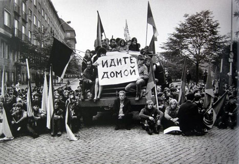 Rassemblement contre l’invasion en Tchécoslovaquie, avec une message écrit en russe destiné aux occupants soviétiques : « rentrez à la maison ».