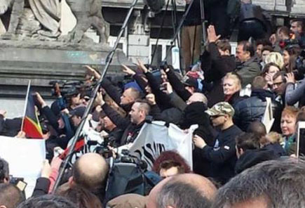 Au rassemblement qui s’est quand même tenu de manière restreinte, on a pu voir aussi pratiquement 500 fascistes faire irruption en tenue sombre, après avoir été accompagné par la police depuis Vilvorde.
