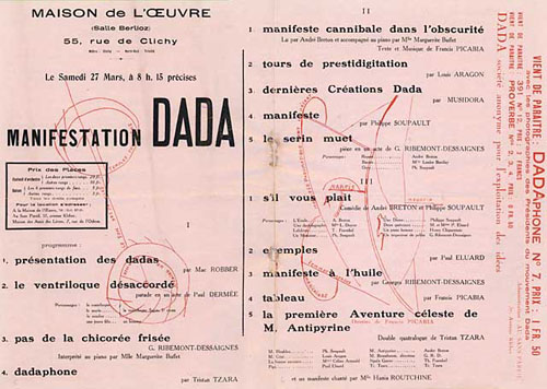 Grande soirée – poème simultané en 3 langues, protestation bruit musique nègre / Hoosenlatz Ho osenlatz / piano Typerary Laterna magica démonstration, proclamation dernière!! invention dialogue!! Dada!! dernière nouveauté!!! syncope bourgeoise, musique bruitiste, dernier cri, chanson Tzara danse protestations – la grosse caisse – lumière rouge, policemen – chansons tableaux cubistes cartes postales chanson Cabaret Voltaire – poème simultané breveté Tzara Ho osentlaz et van Hoddis Hü ülsenbeck Hoosenlatz tourbillon Arp – two-step réclame alcool fument vers les cloches / on chuchote: arrogance / silence Mme Hennings, Janco déclaration, l’art transatlantique = peuple se réjouit étoile projetée sur la danse cubiste en grelots.