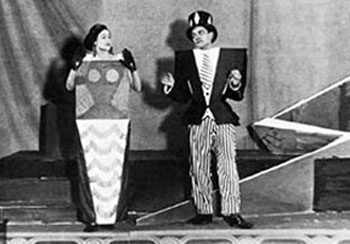 II. 1916. Dans la plus obscure rue sous l’ombre des côtes architecturales, où l’on trouve des detectifs discrets parmi les lanternes rouges – naissance – naissance du Cabaret Voltaire – affiche de Slodky, bois, femme et Cie, muscles du cœur Cabaret Voltaire et des douleurs. Lampes rouges, ouverture piano, Ball lit Tipperary, piano « sous les ponts de Paris », Tzara traduit vite quelques poèmes pour les lire, Mme Hennings – silence, musique – déclaration – fin. Sur les murs: van Rees et Arp, Picasso et Eggeling, Segal et Janco, Slodky, Nadelmann, couleurs papiers, ascendance art nouveau, abstrait et des cartes-poèmes géographiques futuristes: Marinetti, Cangiullo, Buzzi; Cabaret Voltaire, chaque soir on joue, on chante, on récite – le peuple – l’art nouveau le plus grand au peuple – van Hoddis, Benn, Treß – balalaïka – soirée russe, soirée française – des personnages en édition unique apparaissent, récitent ou se suicident, va et vient, la joie du peuple, cris, le mélange cosmopolite de dieU et de boRdel, le cristal et la plus grosse femme du monde: « Sous les ponts de Paris ».