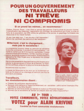 Cette affiche de mai 1974 reprend très exactement ce qui est une narration esthétisée-romantique visant à piéger les gens. Même la page wikipédia de la Jeunesse Communiste Révolutionnaire reprend cette fiction.