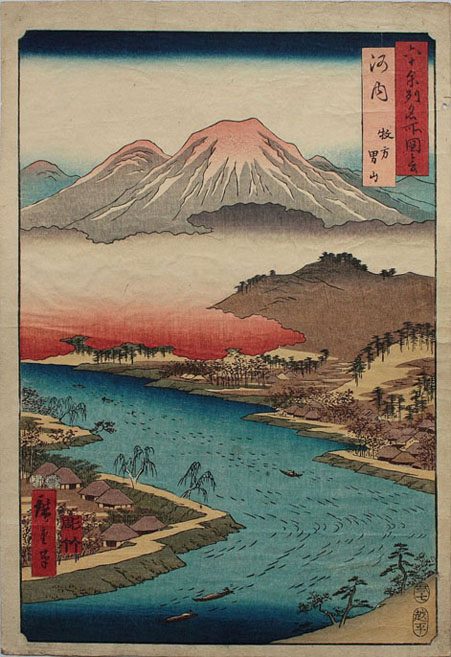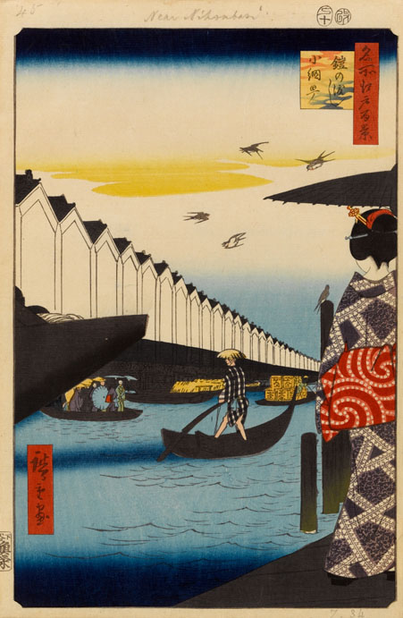 Il fallait pour Utagawa Hiroshige, si l’on voit le conflit entre poésie et réalisme dans Les Soixante-neuf Stations du Kiso Kaidō, basculer dans un sens ou dans un autre. La réponse se trouve dans les Vues des sites célèbres des soixante et quelques provinces du Japon (avec 71 estampes) publiées de 1853 à 1856, et dans les Cent vues d’Edo (avec 69 estampes) publiées en 1856 et 1858.