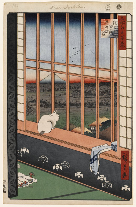 Cette dernière oeuvre avec le chat est très réussi, comme par ailleurs Fukagawa Susaki et Jūmantsubo (avec un aigle) et Minowa, Kanasugi et Mikawashima (avec des grues de Mandchourie).