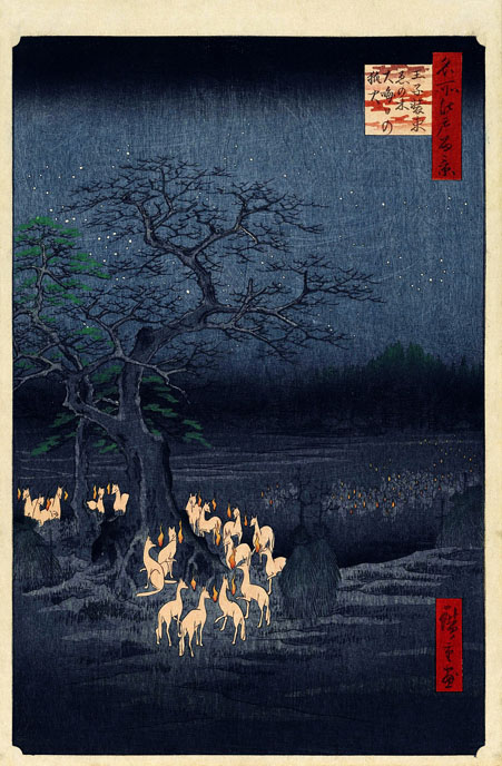 On notera par contre Renards de feu la nuit du Nouvel An sous l’arbre Enoki près d’Ōji, seule estampe sortant du cadre du réalisme, qui annonce déjà une tendance que va avoir justement la culture japonaise à basculer dans les superstitions religieuses, notamment locales, ancrant l’opposition se combinant entre un empereur divin avec une religion nationale et des rites pu préjugés magiques locaux, à dimension folklorique.