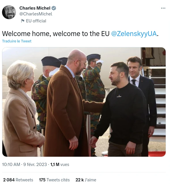 Zelensky a également rencontré directement Charles Michel, qui est l’obscur Président du Conseil européen (obscur car bien malin qui sait quel est le véritable pouvoir et la véritable fonction de cette personne). En tous cas, Charles Michel a également donné dans le scénario américain grandiloquent, en publiant sur Twitter une photo de lui accueillant Zelensky, avec le commentaire suivant :