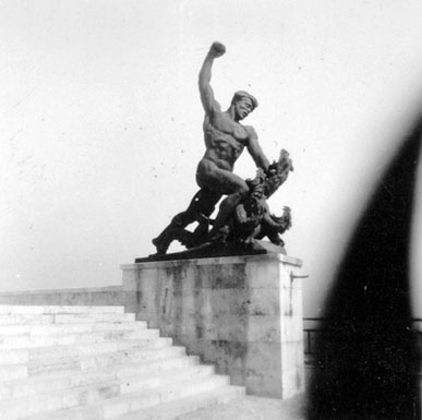 Les trois autres éléments présentent chacun leur particularité. Sur l’un des côtés, on a une figure terrassant un dragon, avec une dimension réaliste s’effaçant pratiquement entièrement derrière l’allégorie. Cela étant, il y a un mouvement qui a un sens dans la mesure où cela correspond au mouvement de la statue lui faisant pendant.