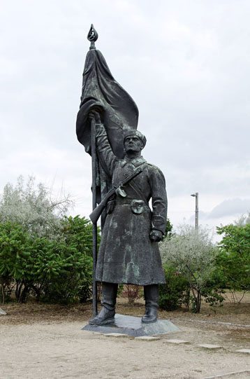 Zsigmond Kisfaludi Strobl a ici formé une oeuvre entière et puissante, un chef d’oeuvre. On a en effet une grande statue allégorie de la victoire surplombant un soldat de l’armée rouge, avec sur les côtés un homme terrassant un dragon et un jeune transportant un flambeau.