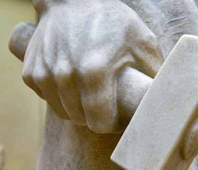 La main de l’homme – qui représente la classe ouvrière – agrippe fermement un marteau, dans une scène pareillement tout à fait réelle. Il ne s’agit pas d’une allégorie abstraite, mais d’être concrète portant leur propre dignité jusqu’à une représentation imagée.