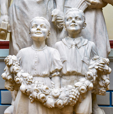 La guirlande, en remerciement à Staline, permet d’éviter la rupture dans ce mouvement inégal, de par sa taille et le fait qu’elle enveloppe les deux enfants, fermant leur marche et les ramenant dans l’espace du couple, mais également de par sa composition avec de multiples fleurs, donnant une impression de multiple par rapport à l’unité de l’oeuvre, et également de pesanteur comme pour équilibrer l’avancée des enfants.